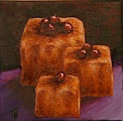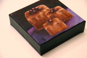 I love painting food. I have sense I was a little girl. It is just so decadent and full of interesting textures. I have painted chocolates before, and always find further inspiration for a new interpretation of rich the little sweets. This piece brims with the perfect solution to that after dinner desire of " I just need a tiny bite of chocolate". I wanted the viewer to be almost able to imagine the smooth thickness of the chocolate icing.