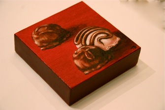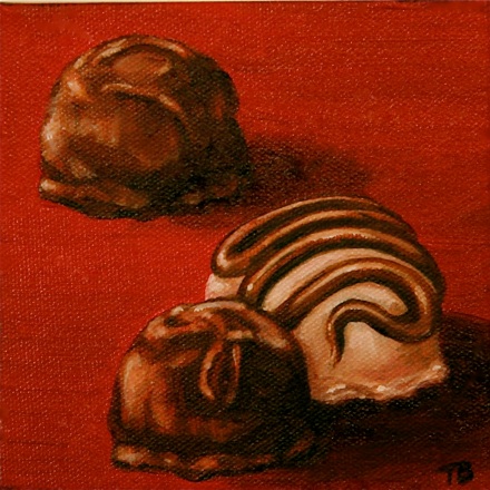 i love painting food. I have sense I was a little girl. It is just so decadent and full of interesting textures. I have painted chocolates before, and always find further inspiration for a new interpretation of rich little sweets. And their deep mocha taste embodies such lush smoothness that I felt that they screamed for a regal red background in which to sit and await their admirer.