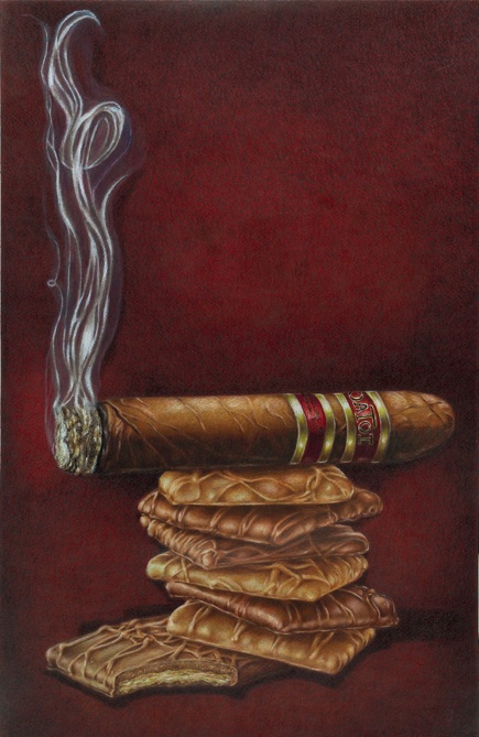 Smoked Chocolates is a piece of art that came from a simple interest in the texture of a cigar and the equally amazing haze that flows forth once lit. And of course I chose to revisit one of my favorite subjects for lushness and texture,.. chocolate. The idea of the rich darkness of the chocolate related so well to the earthy smoked woodiness of the cigar. What the two subjects combined together elude to I will leave up to the viewer.
